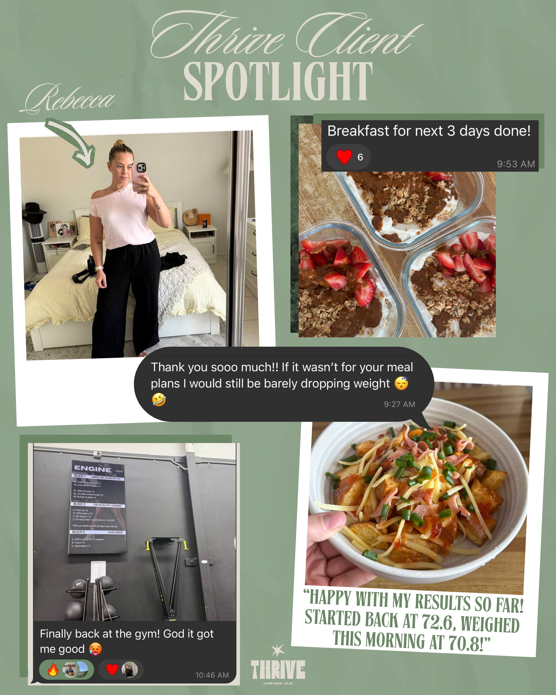 Every round of THRIVE I feel like I just get better and better. I get closer to the person I want to be. I am the most consistent I have ever been, I've truely learnt how to balance food, and healed my relationship with food. The support from Chels is next level!